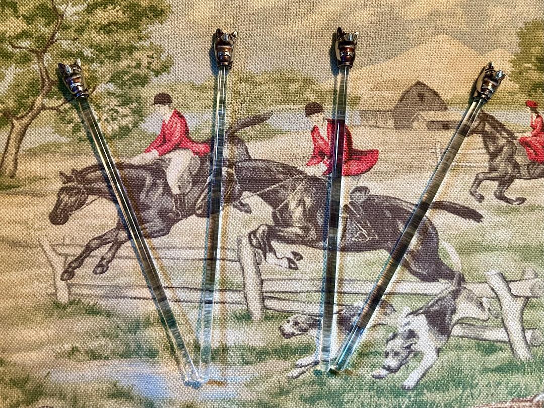 These are adorable glass swizzle sticks. There are four, and each has a pewter fox head cap with a nice patina and each fox sports a bow tie. The swizzles measures 6 1/4" long, all are in excellent condition. These are a true conversation starter and would make a very unique gift.